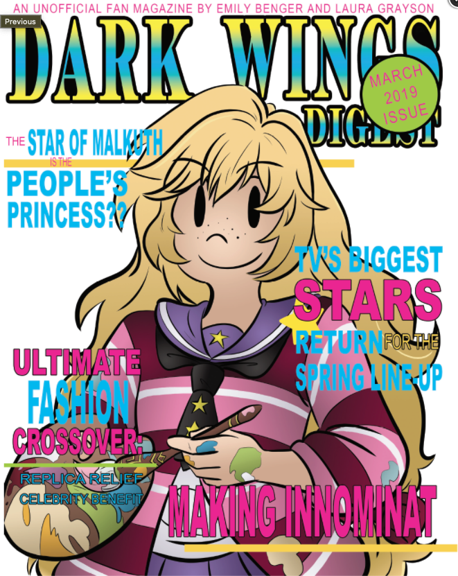 Dark Wings Digest an unofficial Tales of fan magazine. 8.5x11 on glossy paper. There are 24 full color pages and each article is based off a different magazine. At least one character from every mothership Tales game is included in every issue.